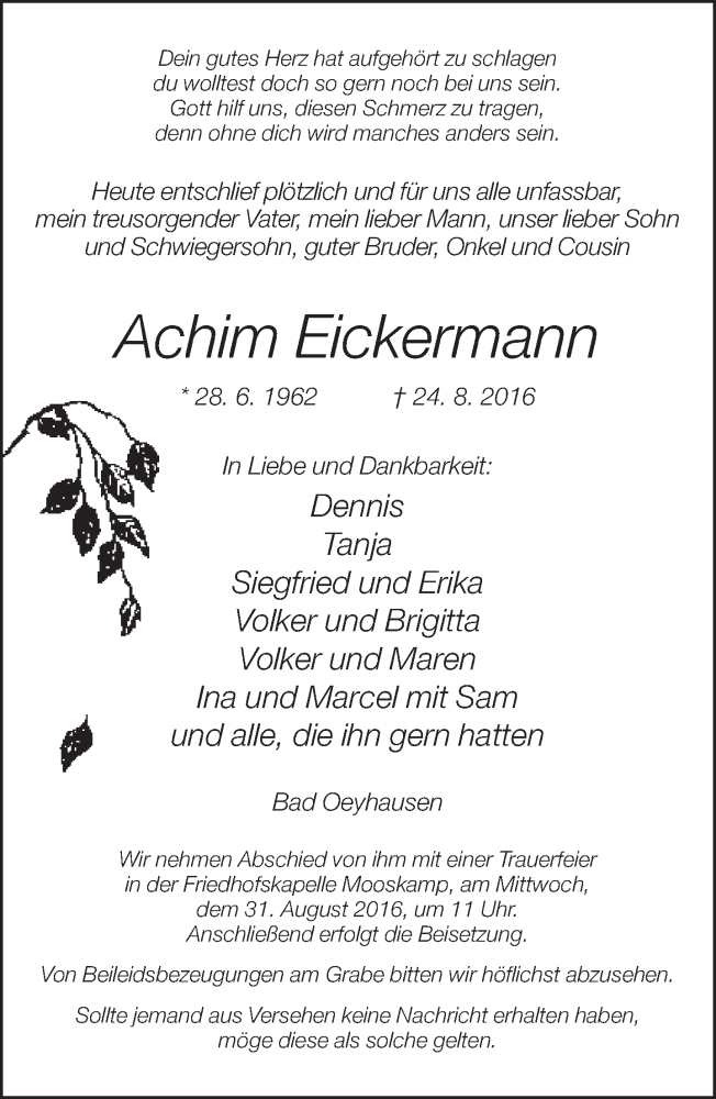 Hier finden Sie alle Traueranzeigen aus der Zeitung, die bisher für Achim Eickermann erschienen sind. Weitere Traueranzeigen, die in der Zeitung erscheinen, werden hier ebenfalls aufgelistet