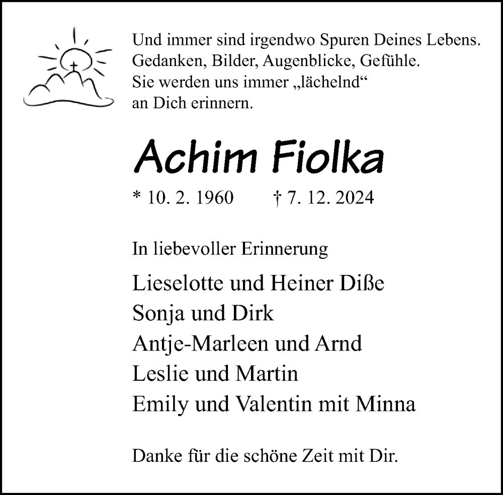 Hier finden Sie alle Traueranzeigen aus der Zeitung, die bisher für Achim Fiolka erschienen sind. Weitere Traueranzeigen, die in der Zeitung erscheinen, werden hier ebenfalls aufgelistet