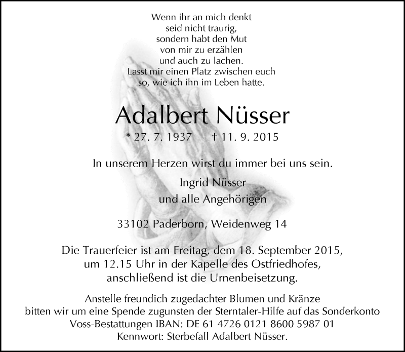 Hier finden Sie alle Traueranzeigen aus der Zeitung, die bisher für Adalbert Nüsser erschienen sind. Weitere Traueranzeigen, die in der Zeitung erscheinen, werden hier ebenfalls aufgelistet