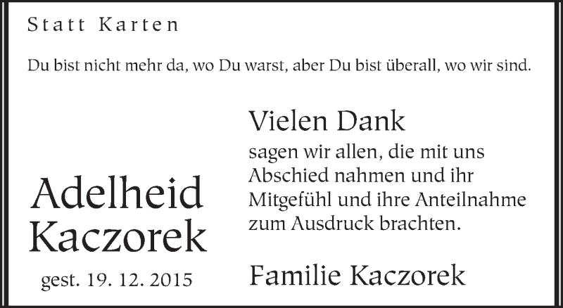 Hier finden Sie alle Traueranzeigen aus der Zeitung, die bisher für Adelheid Kaczorek erschienen sind. Weitere Traueranzeigen, die in der Zeitung erscheinen, werden hier ebenfalls aufgelistet