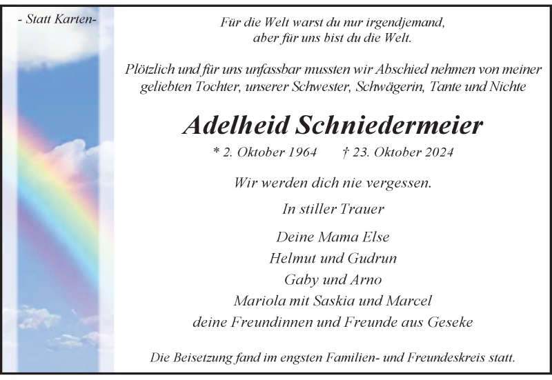 Hier finden Sie alle Traueranzeigen aus der Zeitung, die bisher für Adelheid Schniedermeier erschienen sind. Weitere Traueranzeigen, die in der Zeitung erscheinen, werden hier ebenfalls aufgelistet