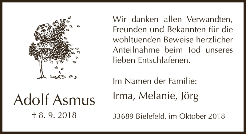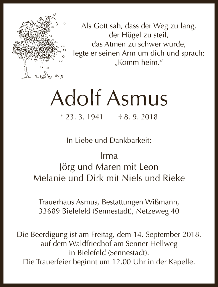 Hier finden Sie alle Traueranzeigen aus der Zeitung, die bisher für Adolf Asmus erschienen sind. Weitere Traueranzeigen, die in der Zeitung erscheinen, werden hier ebenfalls aufgelistet
