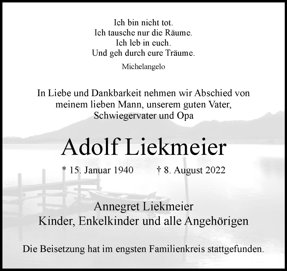Hier finden Sie alle Traueranzeigen aus der Zeitung, die bisher für Adolf Liekmeier erschienen sind. Weitere Traueranzeigen, die in der Zeitung erscheinen, werden hier ebenfalls aufgelistet
