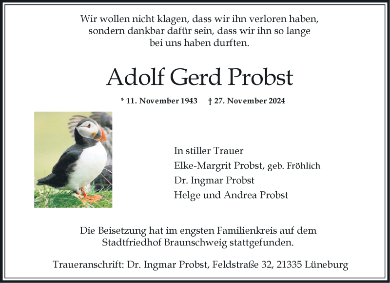Hier finden Sie alle Traueranzeigen aus der Zeitung, die bisher für Adolf Gerd Probst erschienen sind. Weitere Traueranzeigen, die in der Zeitung erscheinen, werden hier ebenfalls aufgelistet