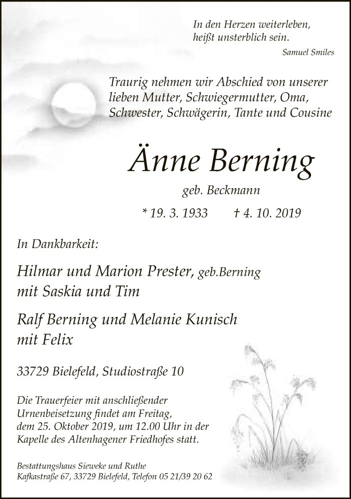 Hier finden Sie alle Traueranzeigen aus der Zeitung, die bisher für Änne Berning erschienen sind. Weitere Traueranzeigen, die in der Zeitung erscheinen, werden hier ebenfalls aufgelistet