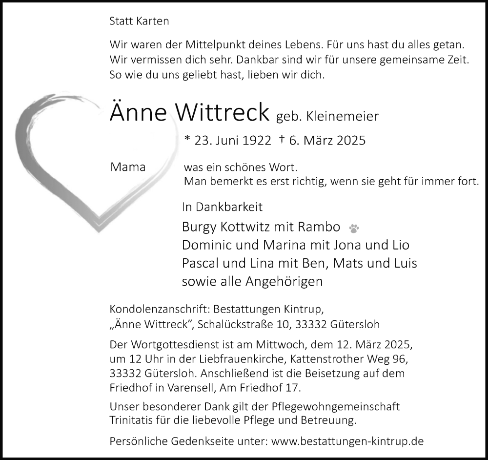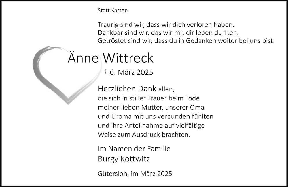 Hier finden Sie alle Traueranzeigen aus der Zeitung, die bisher für Änne Wittreck erschienen sind. Weitere Traueranzeigen, die in der Zeitung erscheinen, werden hier ebenfalls aufgelistet