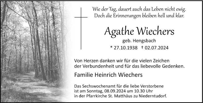 Hier finden Sie alle Traueranzeigen aus der Zeitung, die bisher für Agathe Wiechers erschienen sind. Weitere Traueranzeigen, die in der Zeitung erscheinen, werden hier ebenfalls aufgelistet