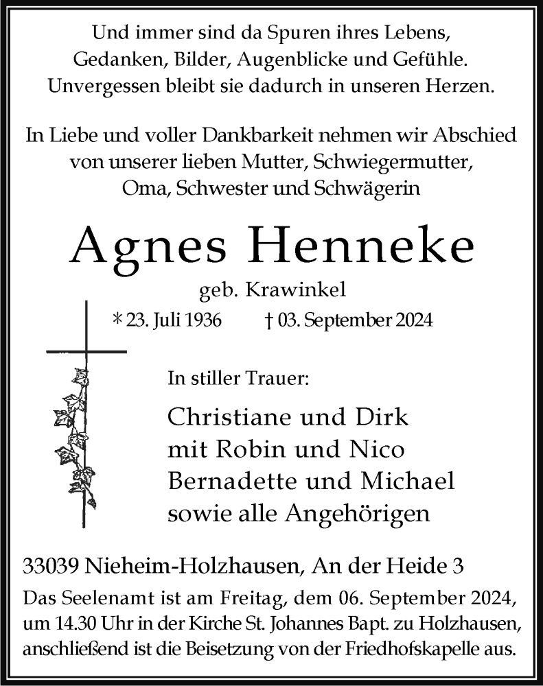 Hier finden Sie alle Traueranzeigen aus der Zeitung, die bisher für Agnes Henneke erschienen sind. Weitere Traueranzeigen, die in der Zeitung erscheinen, werden hier ebenfalls aufgelistet