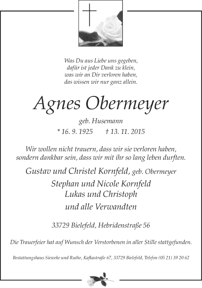 Hier finden Sie alle Traueranzeigen aus der Zeitung, die bisher für Agnes Obermeyer erschienen sind. Weitere Traueranzeigen, die in der Zeitung erscheinen, werden hier ebenfalls aufgelistet