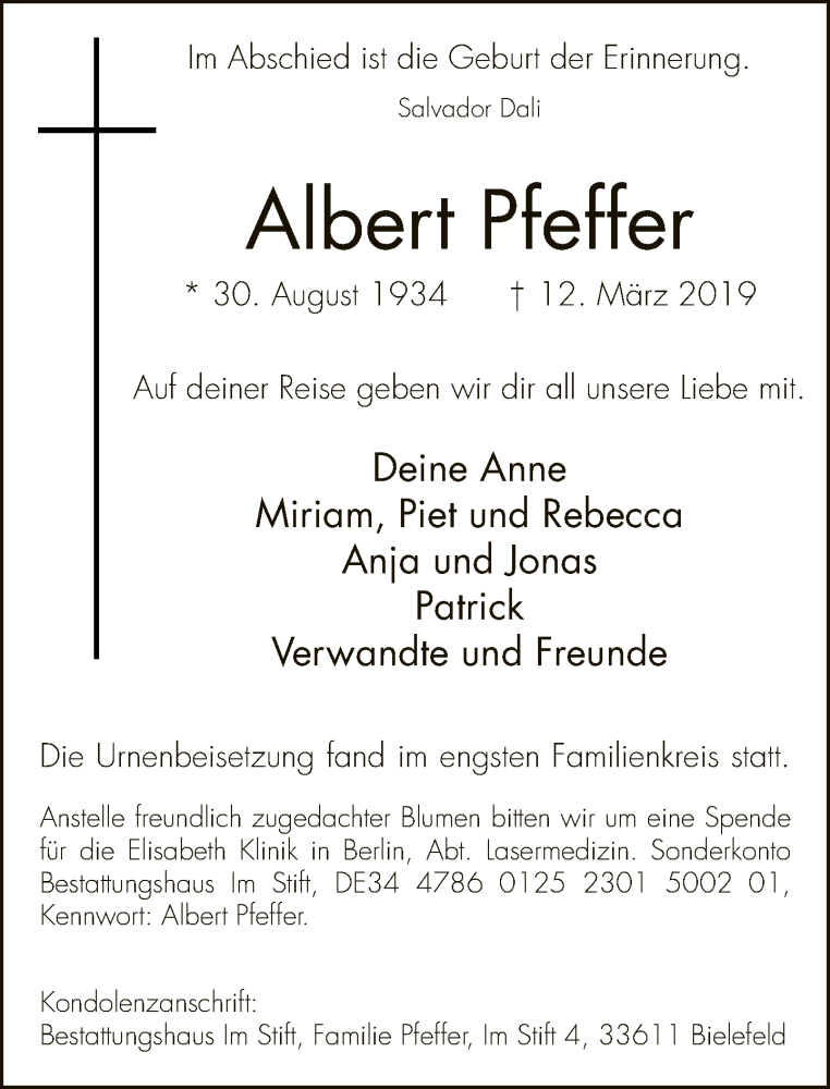 Hier finden Sie alle Traueranzeigen aus der Zeitung, die bisher für Albert Pfeffer erschienen sind. Weitere Traueranzeigen, die in der Zeitung erscheinen, werden hier ebenfalls aufgelistet