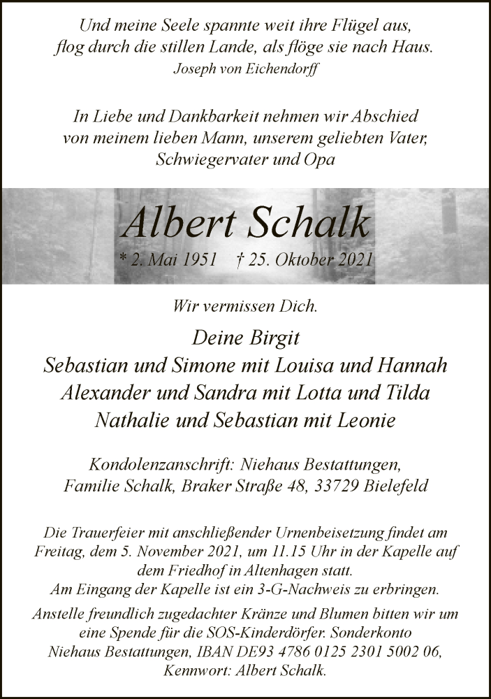 Hier finden Sie alle Traueranzeigen aus der Zeitung, die bisher für Albert Schalk erschienen sind. Weitere Traueranzeigen, die in der Zeitung erscheinen, werden hier ebenfalls aufgelistet