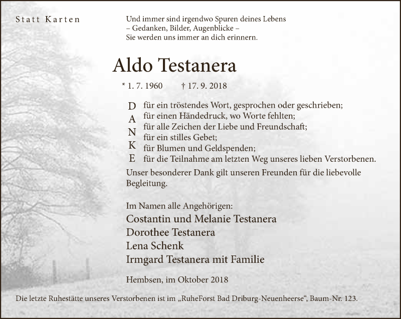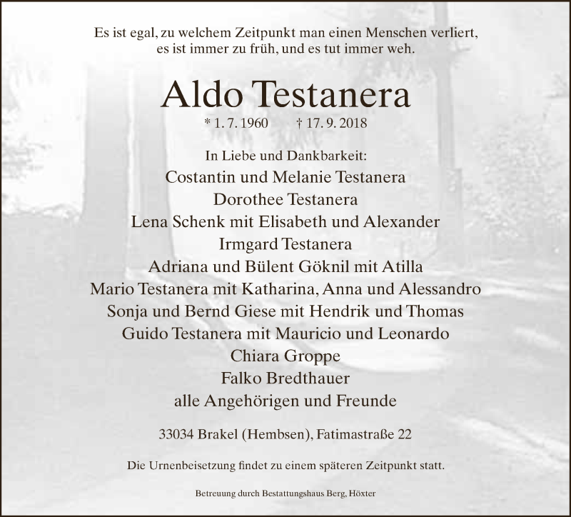Hier finden Sie alle Traueranzeigen aus der Zeitung, die bisher für Aldo Testanera erschienen sind. Weitere Traueranzeigen, die in der Zeitung erscheinen, werden hier ebenfalls aufgelistet