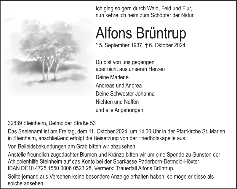 Hier finden Sie alle Traueranzeigen aus der Zeitung, die bisher für Alfons Brüntrup erschienen sind. Weitere Traueranzeigen, die in der Zeitung erscheinen, werden hier ebenfalls aufgelistet