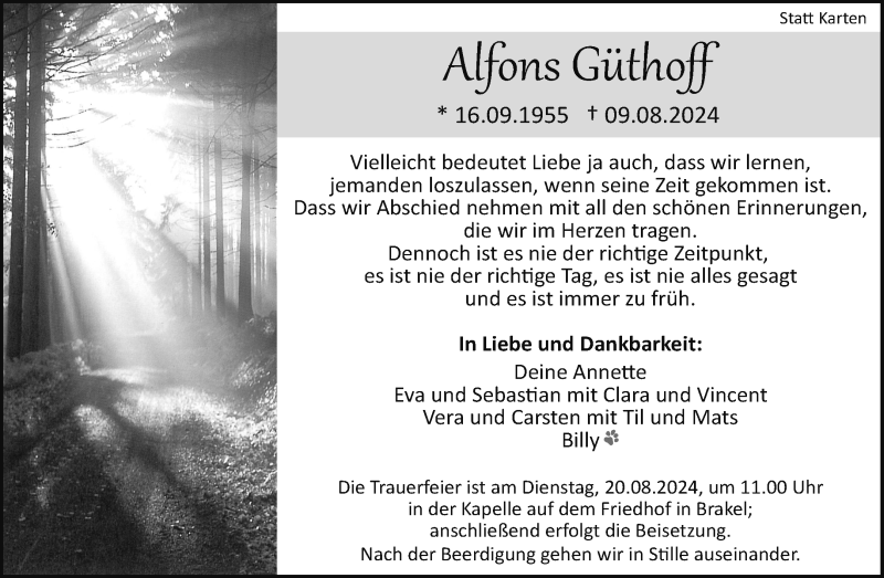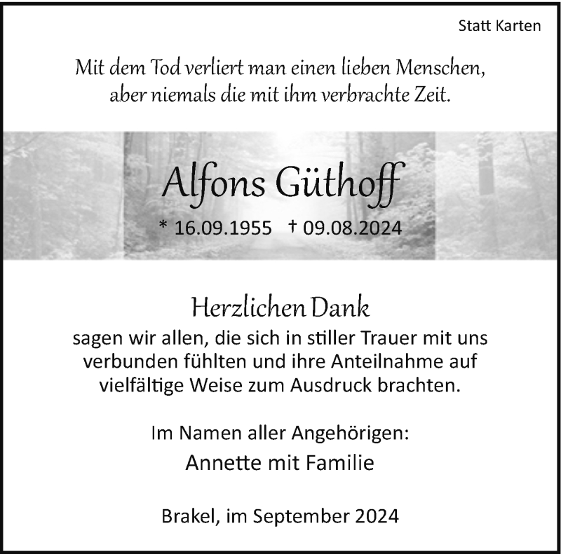 Hier finden Sie alle Traueranzeigen aus der Zeitung, die bisher für Alfons Güthoff erschienen sind. Weitere Traueranzeigen, die in der Zeitung erscheinen, werden hier ebenfalls aufgelistet
