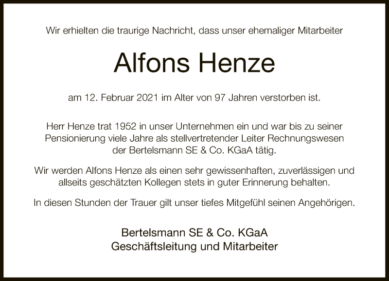 Hier finden Sie alle Traueranzeigen aus der Zeitung, die bisher für Alfons Henze erschienen sind. Weitere Traueranzeigen, die in der Zeitung erscheinen, werden hier ebenfalls aufgelistet