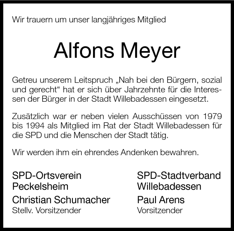 Hier finden Sie alle Traueranzeigen aus der Zeitung, die bisher für Alfons Meyer erschienen sind. Weitere Traueranzeigen, die in der Zeitung erscheinen, werden hier ebenfalls aufgelistet