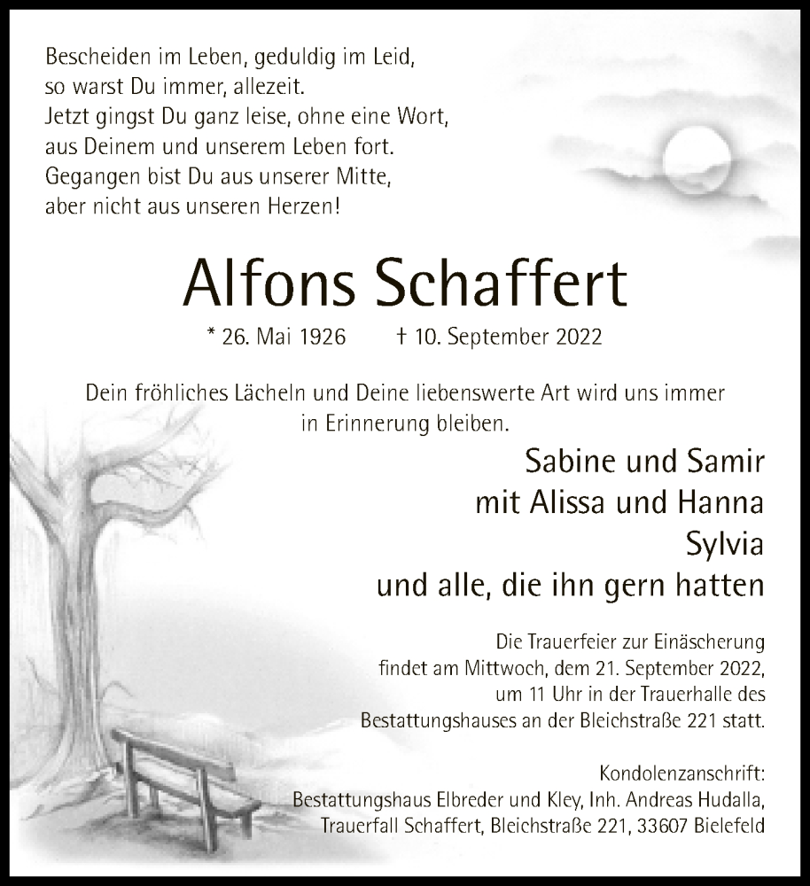 Hier finden Sie alle Traueranzeigen aus der Zeitung, die bisher für Alfons Schaffert erschienen sind. Weitere Traueranzeigen, die in der Zeitung erscheinen, werden hier ebenfalls aufgelistet