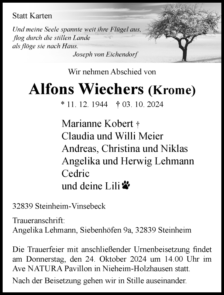 Hier finden Sie alle Traueranzeigen aus der Zeitung, die bisher für Alfons Wiechers erschienen sind. Weitere Traueranzeigen, die in der Zeitung erscheinen, werden hier ebenfalls aufgelistet