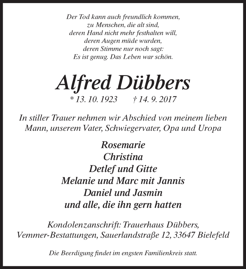 Hier finden Sie alle Traueranzeigen aus der Zeitung, die bisher für Alfred Dübbers erschienen sind. Weitere Traueranzeigen, die in der Zeitung erscheinen, werden hier ebenfalls aufgelistet