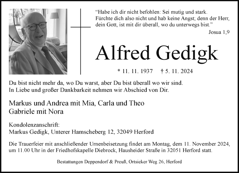 Hier finden Sie alle Traueranzeigen aus der Zeitung, die bisher für Alfred Gedigk erschienen sind. Weitere Traueranzeigen, die in der Zeitung erscheinen, werden hier ebenfalls aufgelistet