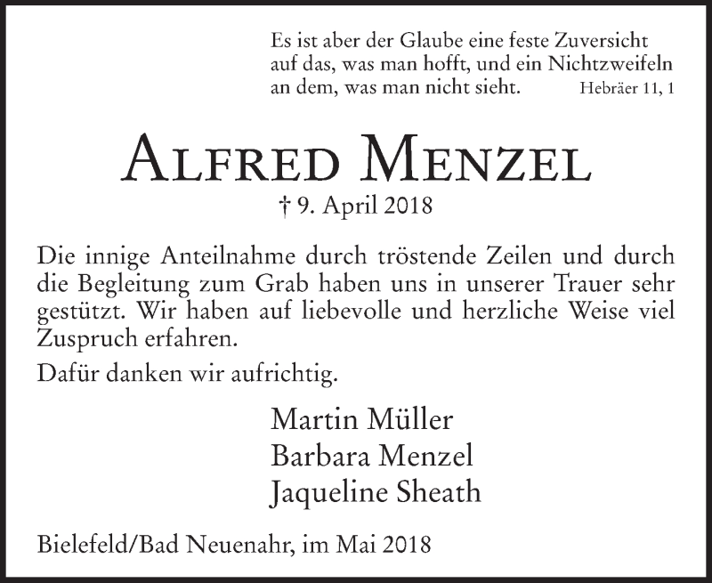 Hier finden Sie alle Traueranzeigen aus der Zeitung, die bisher für Alfred Menzel erschienen sind. Weitere Traueranzeigen, die in der Zeitung erscheinen, werden hier ebenfalls aufgelistet