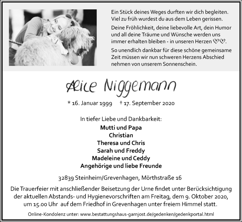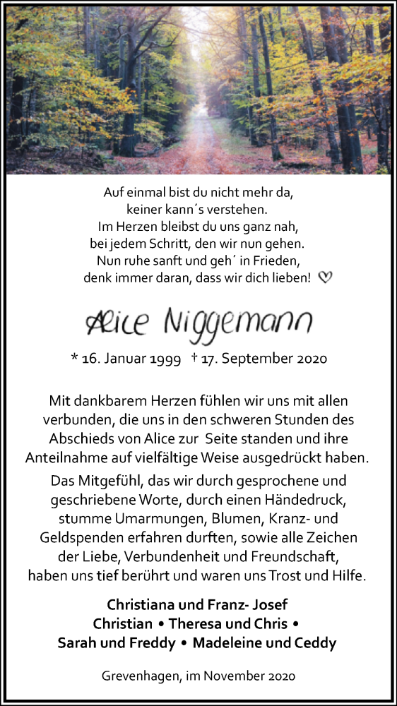 Hier finden Sie alle Traueranzeigen aus der Zeitung, die bisher für Alice Niggemann erschienen sind. Weitere Traueranzeigen, die in der Zeitung erscheinen, werden hier ebenfalls aufgelistet