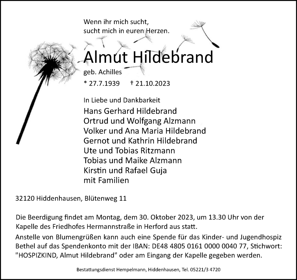 Hier finden Sie alle Traueranzeigen aus der Zeitung, die bisher für Almut Hildebrand erschienen sind. Weitere Traueranzeigen, die in der Zeitung erscheinen, werden hier ebenfalls aufgelistet