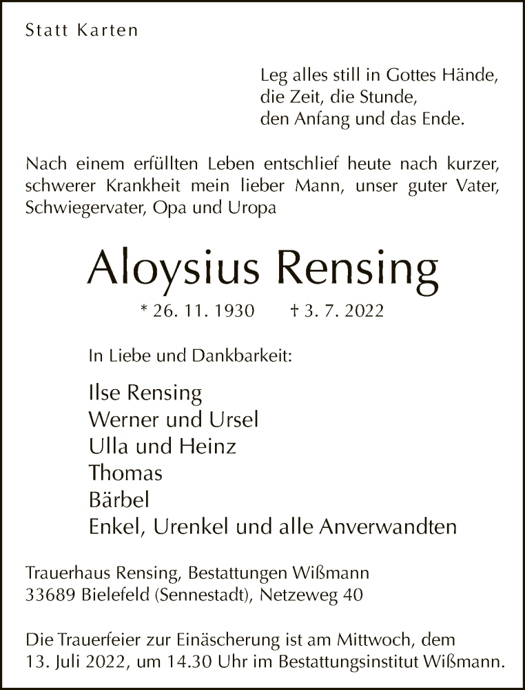 Hier finden Sie alle Traueranzeigen aus der Zeitung, die bisher für Aloysius Rensing erschienen sind. Weitere Traueranzeigen, die in der Zeitung erscheinen, werden hier ebenfalls aufgelistet