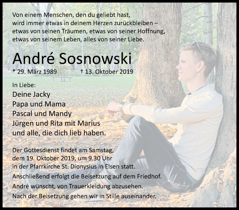 Hier finden Sie alle Traueranzeigen aus der Zeitung, die bisher für Andre Sosnowski erschienen sind. Weitere Traueranzeigen, die in der Zeitung erscheinen, werden hier ebenfalls aufgelistet