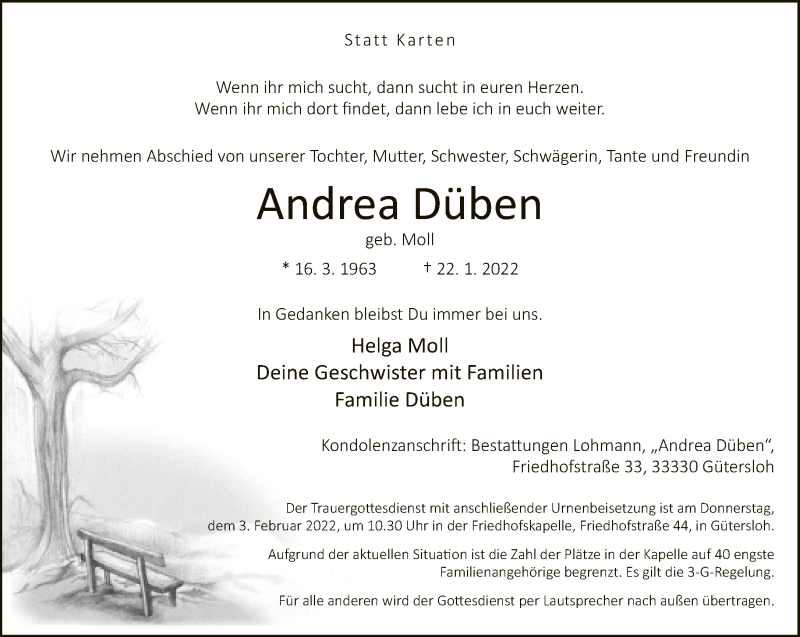 Hier finden Sie alle Traueranzeigen aus der Zeitung, die bisher für Andrea Düben erschienen sind. Weitere Traueranzeigen, die in der Zeitung erscheinen, werden hier ebenfalls aufgelistet