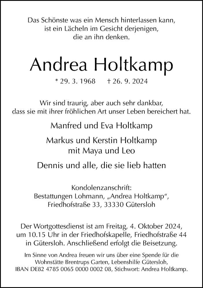 Hier finden Sie alle Traueranzeigen aus der Zeitung, die bisher für Andrea Holtkamp erschienen sind. Weitere Traueranzeigen, die in der Zeitung erscheinen, werden hier ebenfalls aufgelistet