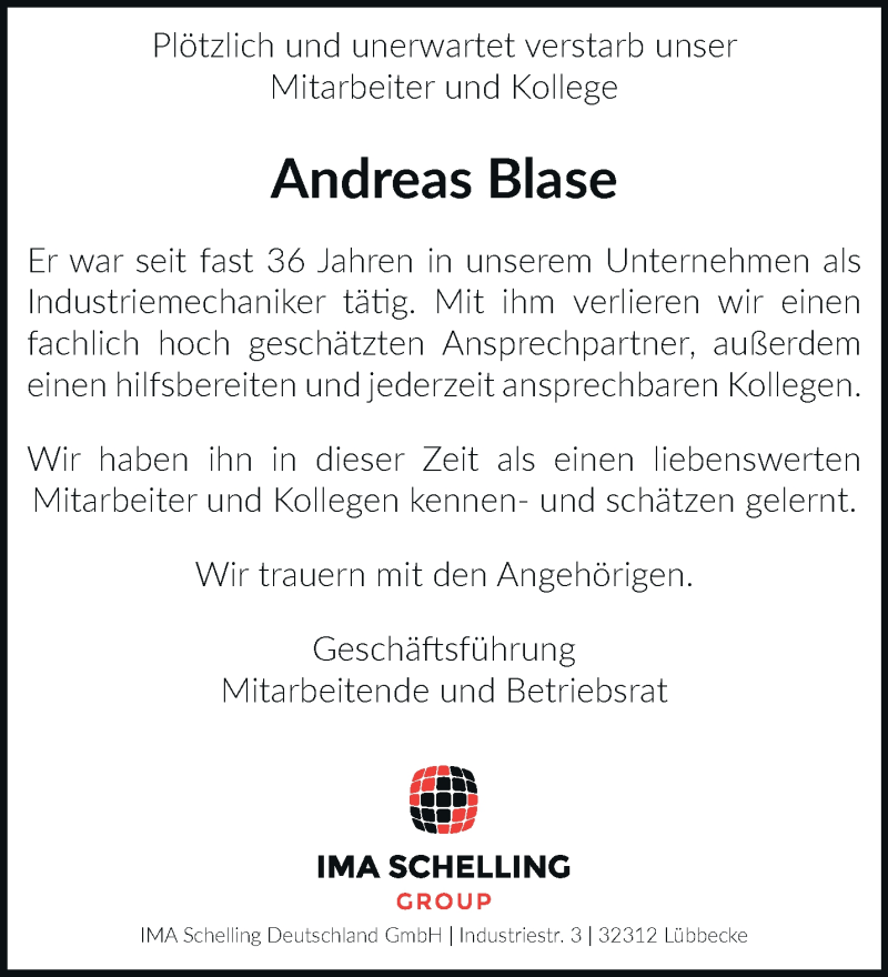 Hier finden Sie alle Traueranzeigen aus der Zeitung, die bisher für Andreas Blase erschienen sind. Weitere Traueranzeigen, die in der Zeitung erscheinen, werden hier ebenfalls aufgelistet