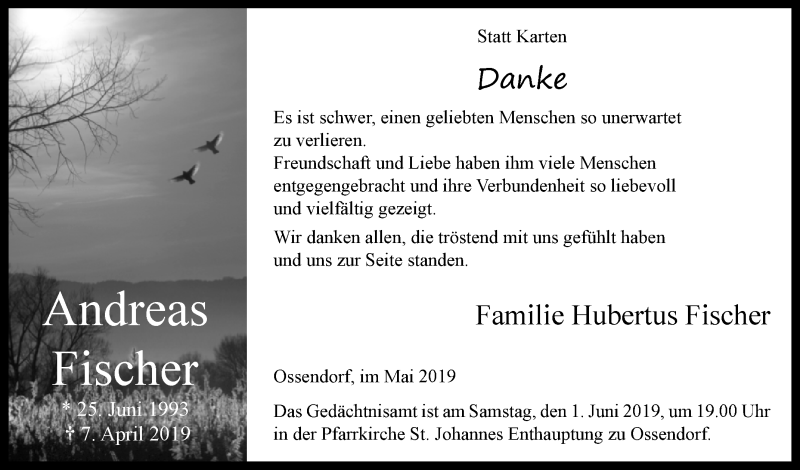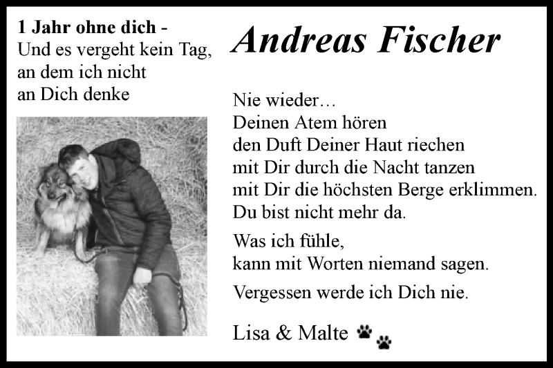 Hier finden Sie alle Traueranzeigen aus der Zeitung, die bisher für Andreas Fischer erschienen sind. Weitere Traueranzeigen, die in der Zeitung erscheinen, werden hier ebenfalls aufgelistet