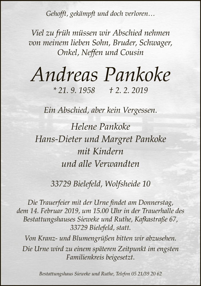Hier finden Sie alle Traueranzeigen aus der Zeitung, die bisher für Andreas Pankoke erschienen sind. Weitere Traueranzeigen, die in der Zeitung erscheinen, werden hier ebenfalls aufgelistet