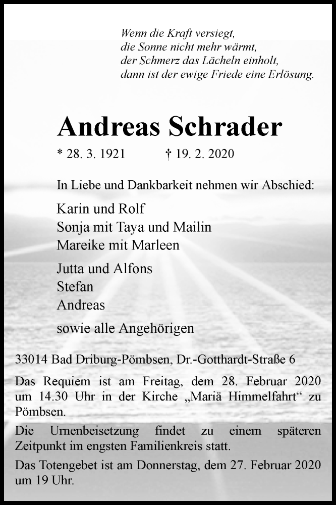 Hier finden Sie alle Traueranzeigen aus der Zeitung, die bisher für Andreas Schrader erschienen sind. Weitere Traueranzeigen, die in der Zeitung erscheinen, werden hier ebenfalls aufgelistet