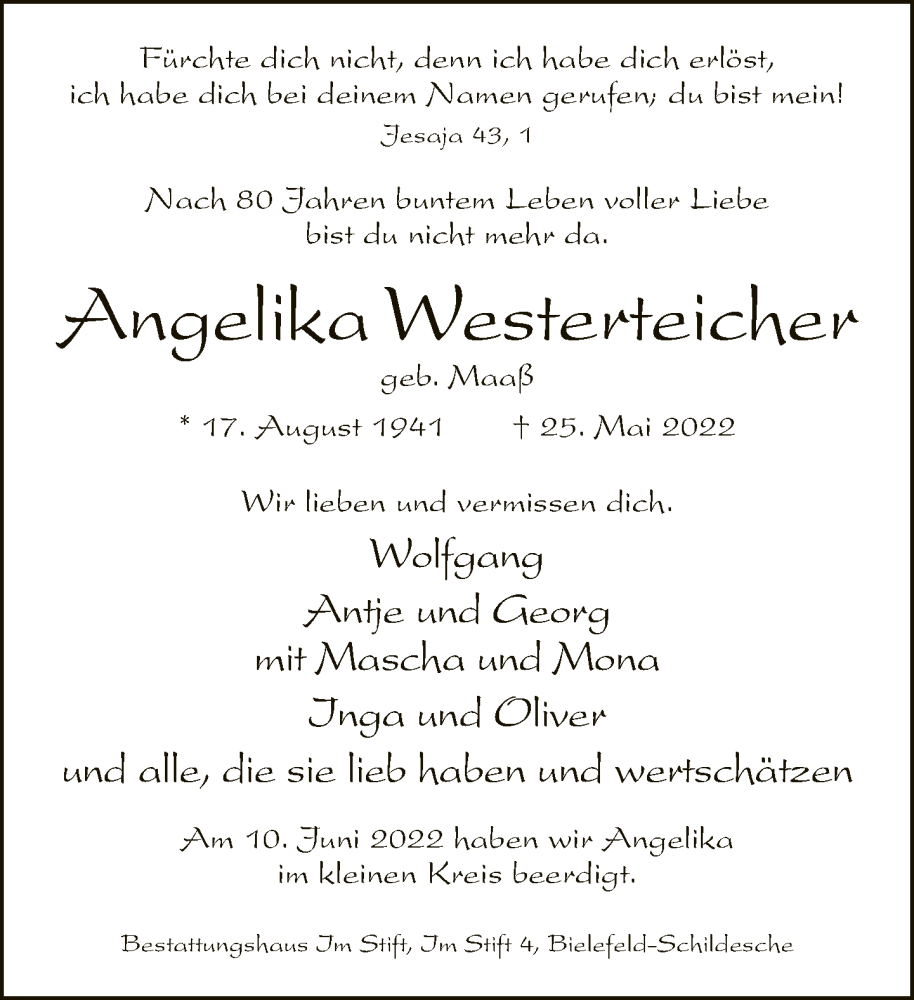 Hier finden Sie alle Traueranzeigen aus der Zeitung, die bisher für Angelika Westerteicher erschienen sind. Weitere Traueranzeigen, die in der Zeitung erscheinen, werden hier ebenfalls aufgelistet