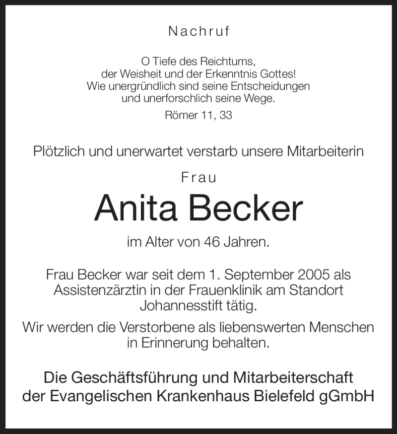 Hier finden Sie alle Traueranzeigen aus der Zeitung, die bisher für Anita Becker erschienen sind. Weitere Traueranzeigen, die in der Zeitung erscheinen, werden hier ebenfalls aufgelistet