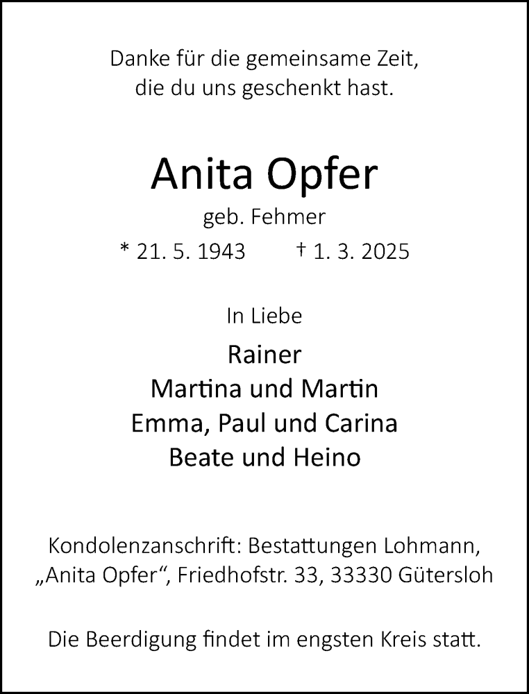 Hier finden Sie alle Traueranzeigen aus der Zeitung, die bisher für Anita Opfer erschienen sind. Weitere Traueranzeigen, die in der Zeitung erscheinen, werden hier ebenfalls aufgelistet