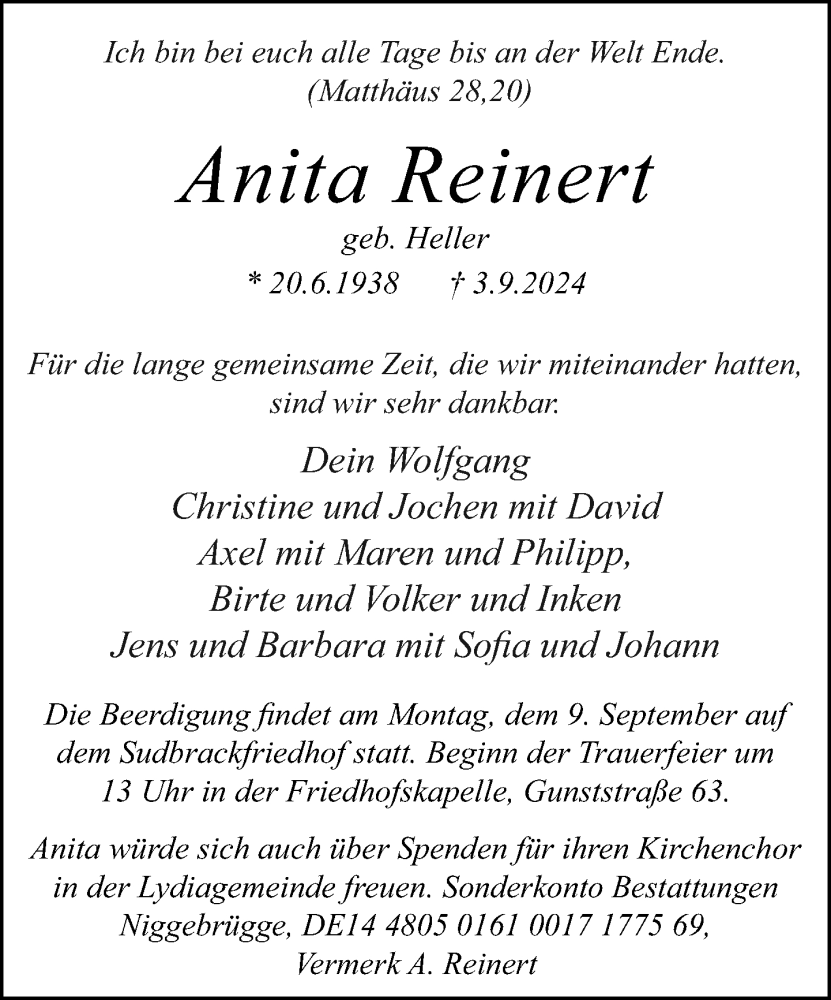 Hier finden Sie alle Traueranzeigen aus der Zeitung, die bisher für Anita Reinert erschienen sind. Weitere Traueranzeigen, die in der Zeitung erscheinen, werden hier ebenfalls aufgelistet