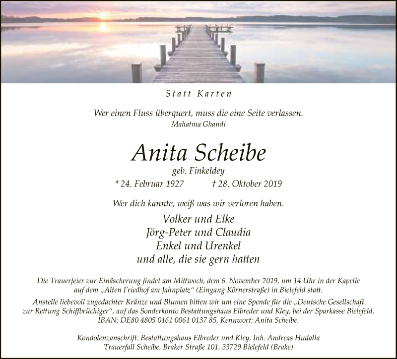 Hier finden Sie alle Traueranzeigen aus der Zeitung, die bisher für Anita Scheibe erschienen sind. Weitere Traueranzeigen, die in der Zeitung erscheinen, werden hier ebenfalls aufgelistet