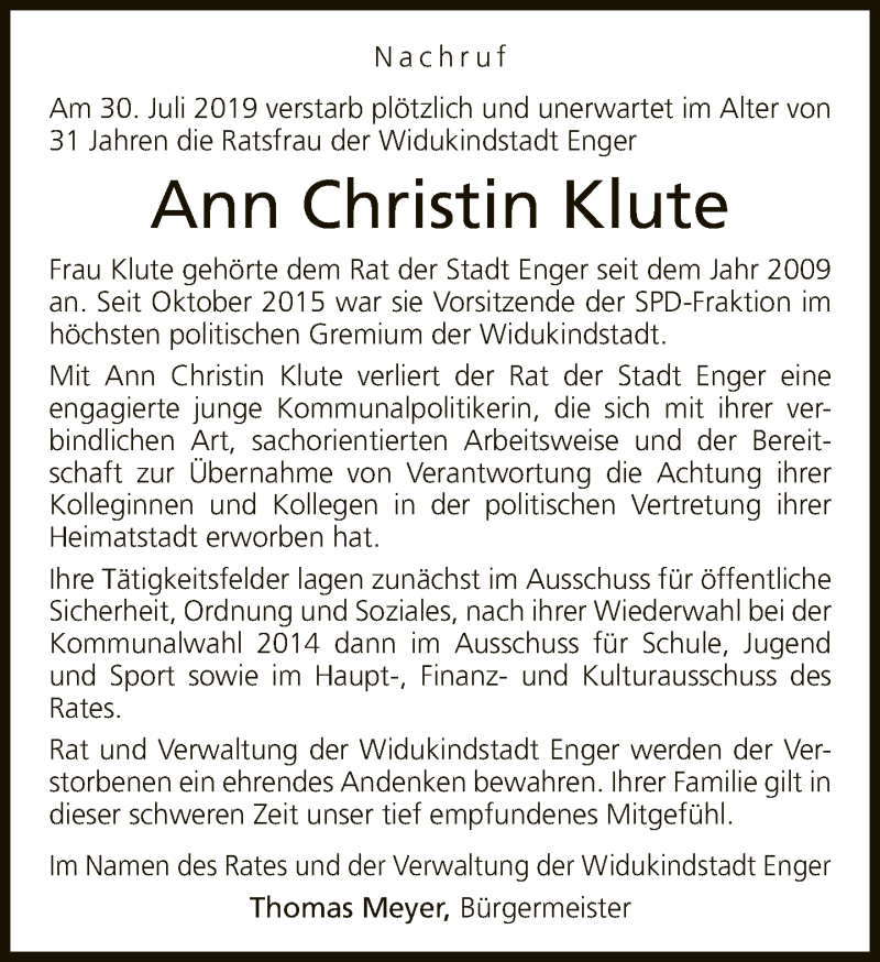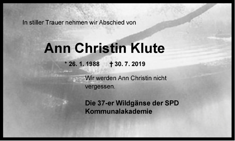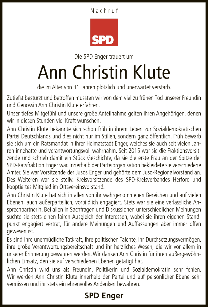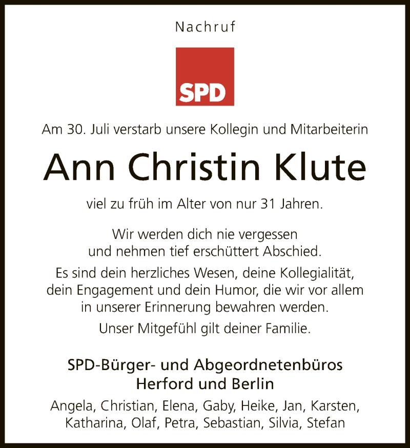 Hier finden Sie alle Traueranzeigen aus der Zeitung, die bisher für Ann Christin Klute erschienen sind. Weitere Traueranzeigen, die in der Zeitung erscheinen, werden hier ebenfalls aufgelistet