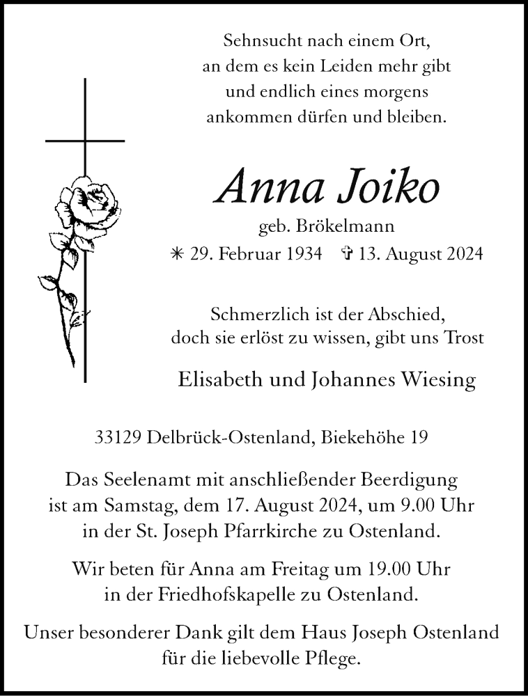 Hier finden Sie alle Traueranzeigen aus der Zeitung, die bisher für Anna Joiko erschienen sind. Weitere Traueranzeigen, die in der Zeitung erscheinen, werden hier ebenfalls aufgelistet