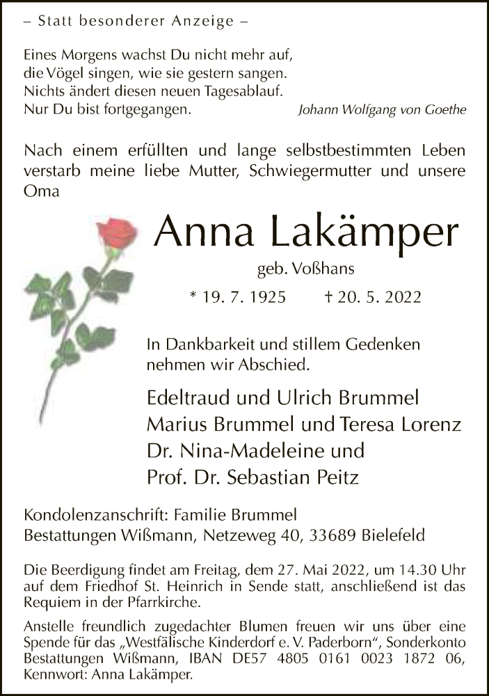 Hier finden Sie alle Traueranzeigen aus der Zeitung, die bisher für Anna Lakämper erschienen sind. Weitere Traueranzeigen, die in der Zeitung erscheinen, werden hier ebenfalls aufgelistet