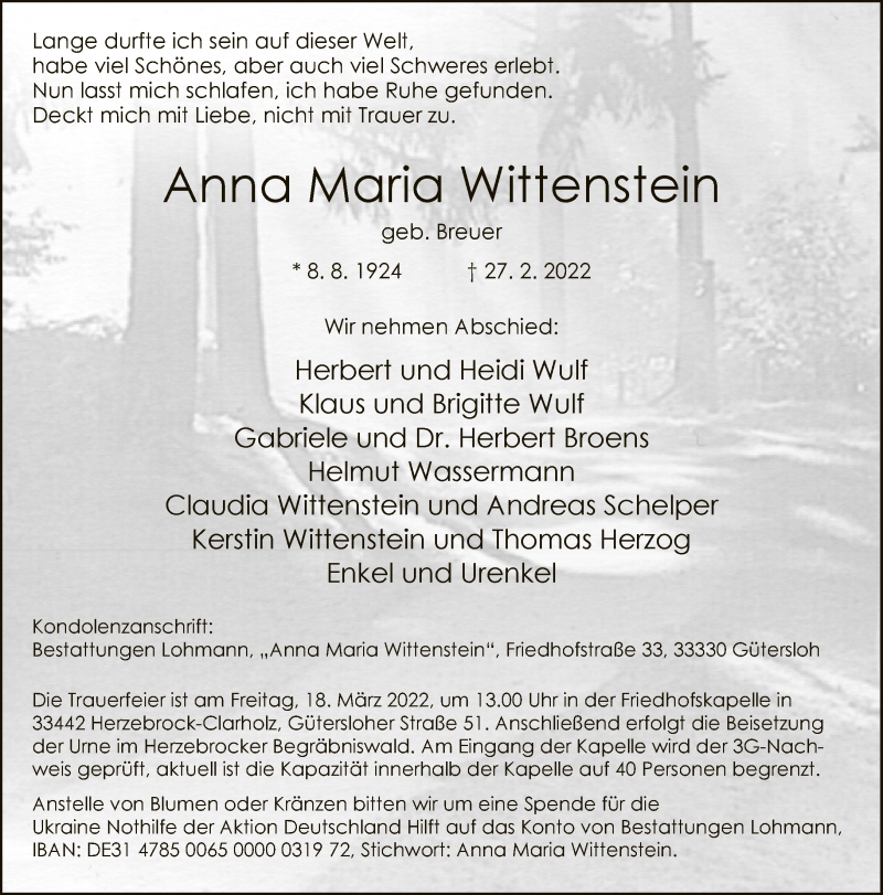 Hier finden Sie alle Traueranzeigen aus der Zeitung, die bisher für Anna Maria Wittenstein erschienen sind. Weitere Traueranzeigen, die in der Zeitung erscheinen, werden hier ebenfalls aufgelistet