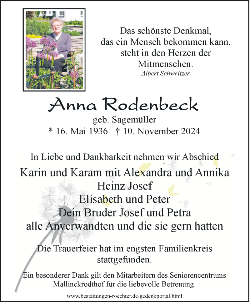 Hier finden Sie alle Traueranzeigen aus der Zeitung, die bisher für Anna Rodenbeck erschienen sind. Weitere Traueranzeigen, die in der Zeitung erscheinen, werden hier ebenfalls aufgelistet