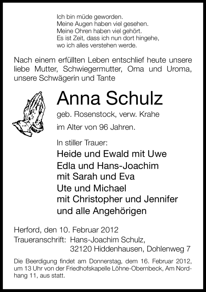 Hier finden Sie alle Traueranzeigen aus der Zeitung, die bisher für Anna Schulz erschienen sind. Weitere Traueranzeigen, die in der Zeitung erscheinen, werden hier ebenfalls aufgelistet