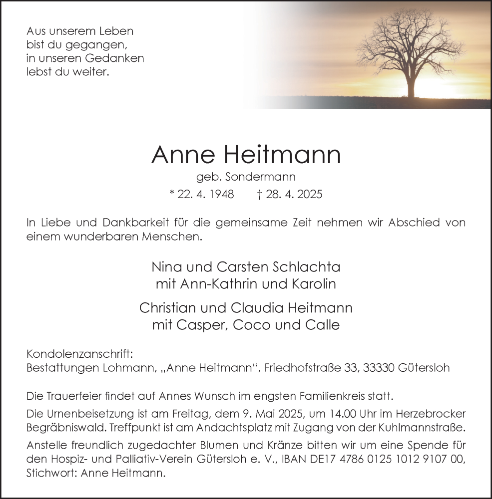Hier finden Sie alle Traueranzeigen aus der Zeitung, die bisher für Anne Heitmann erschienen sind. Weitere Traueranzeigen, die in der Zeitung erscheinen, werden hier ebenfalls aufgelistet