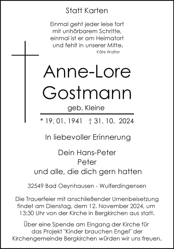 Hier finden Sie alle Traueranzeigen aus der Zeitung, die bisher für Anne-Lore Gostmann erschienen sind. Weitere Traueranzeigen, die in der Zeitung erscheinen, werden hier ebenfalls aufgelistet