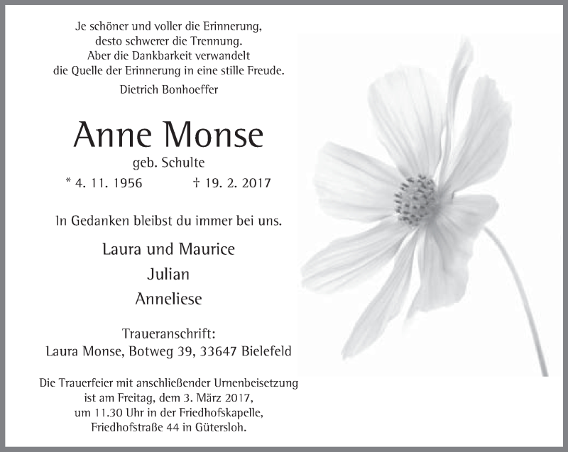 Hier finden Sie alle Traueranzeigen aus der Zeitung, die bisher für Anne Monse erschienen sind. Weitere Traueranzeigen, die in der Zeitung erscheinen, werden hier ebenfalls aufgelistet