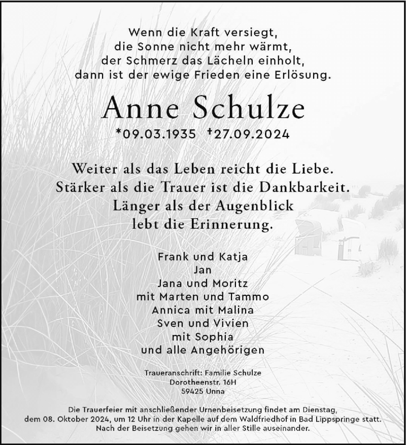 Hier finden Sie alle Traueranzeigen aus der Zeitung, die bisher für Anne Schulze erschienen sind. Weitere Traueranzeigen, die in der Zeitung erscheinen, werden hier ebenfalls aufgelistet